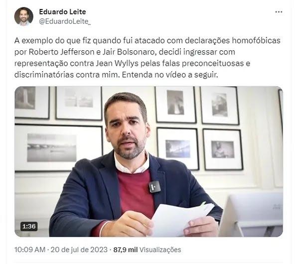 “Não interessa se é da direita ou da esquerda. Não interessa a cor da bandeira que carrega. O que importa é que homofobia, preconceito, discriminação não podem ser tolerados. A sociedade que a gente defende é uma sociedade de respeito, de tolerância, em que as pessoas sejam julgadas pelo seu caráter, pela sua capacidade, pela sua honestidade, não pela cor da pele, não pela crença religiosa, não pela orientação sexual. Homofobia, venha do lado que vier, preconceito e discriminação, venha do lado que vier, da cor da bandeira que cada um segurar, não pode ser tolerado e por isso eu faço essa representação junto ao Ministério Público”, disse Eduardo Leite em um vídeo postado no Twitter.