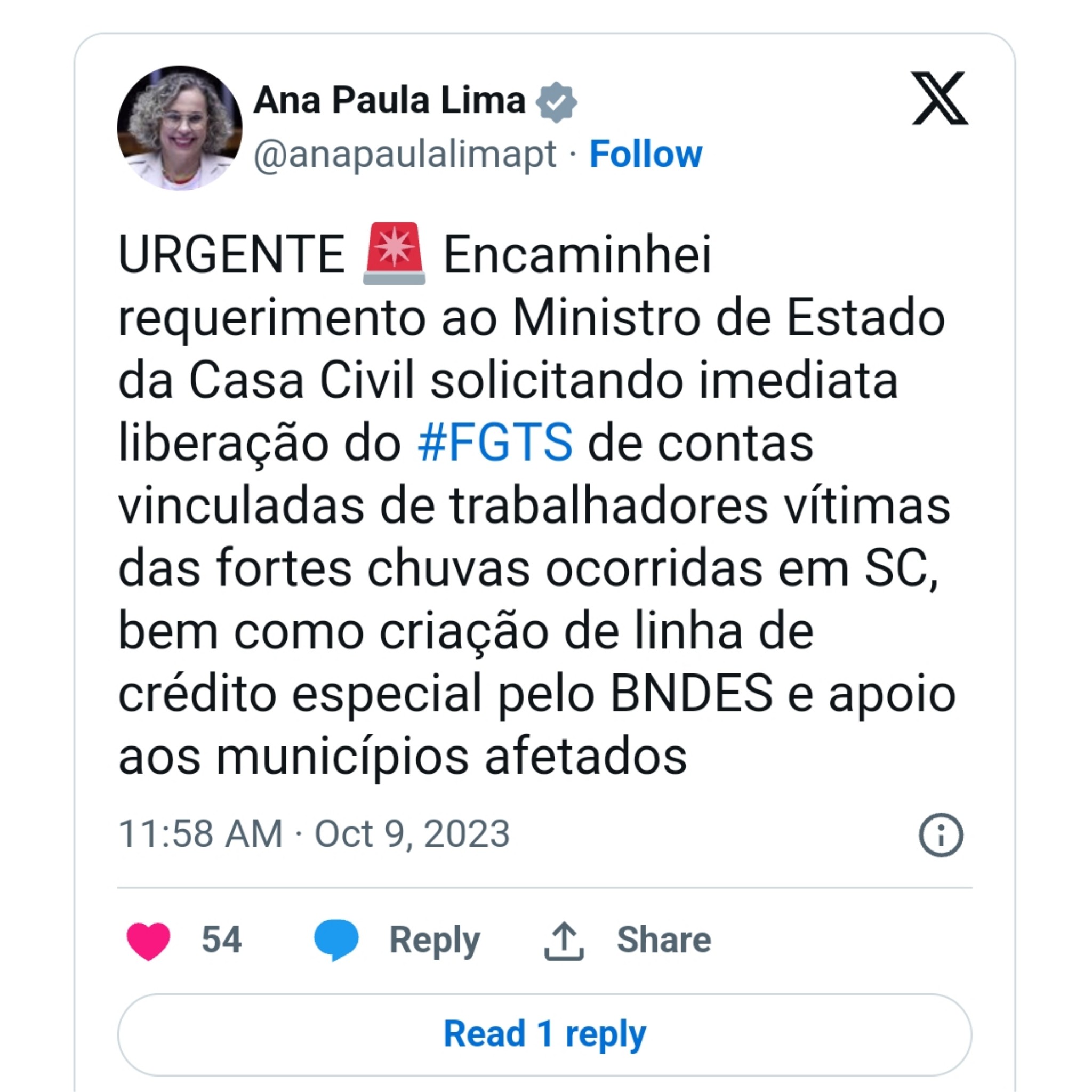 Nesta última segunda-feira (9) a deputada enviou requerimento ao ministro da Casa Civil Rui Costa solicitando imediata liberação do FGTS de contas vinculadas de trabalhadores vítimas das chuvas, criação de linha de crédito especial pelo BNDES e apoio aos municípios afetados, conforme postado em seu Twitter.