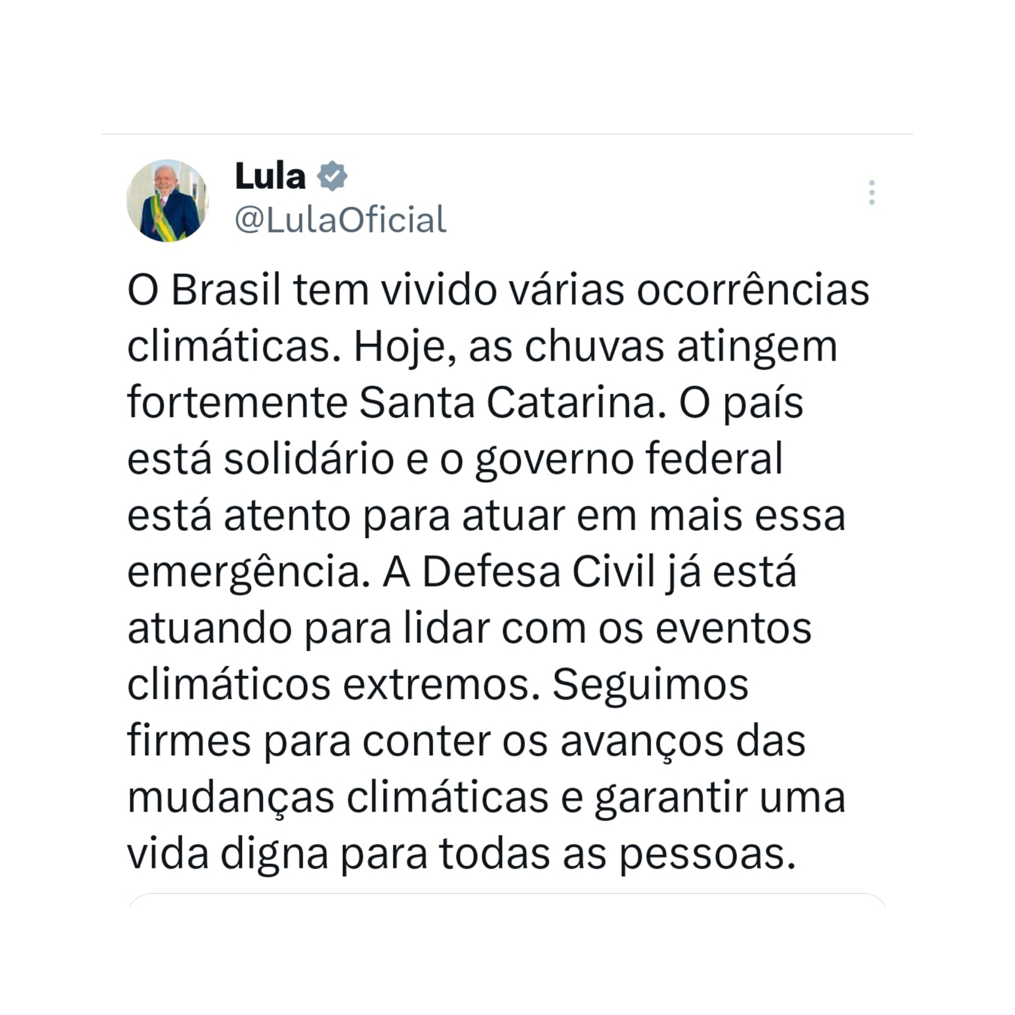 ” A ação do governo federal está perfeita! Ele está presente! federal não precisou nem ser chamado. Logo que passamos as primeiras informações, o ministro da Integração e Desenvolvimento Regional (Waldez Góes) ligou para o governador do estado (Jorginho Mello) se colocando à disposição para o que fosse necessário nessa ação primeira e humanitária que é garantir e salvar vidas”, destacou a deputada e vice-líder do governo na Câmara, Ana Paula Lima (PT-SC).
