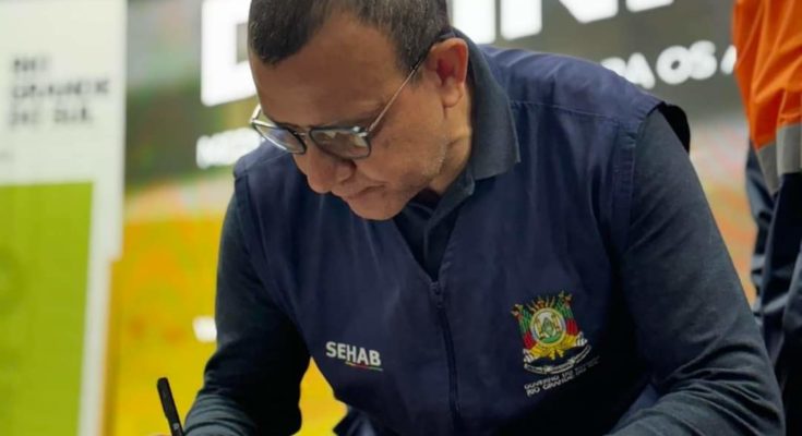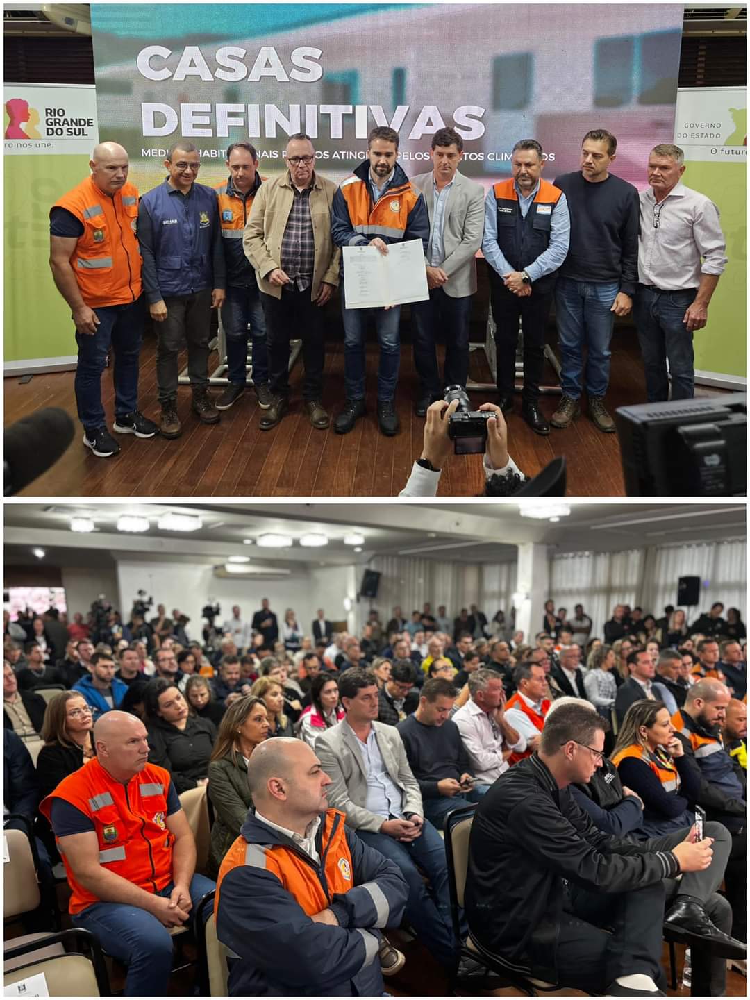 O governador Eduardo Leite assinou na manhã desta quinta-feira, dia 23, em Estrela a ordem de início para a construção das casas definitivas para desabrigados pelas enchentes de 2023 e 2024 no Rio Grande do Sul.