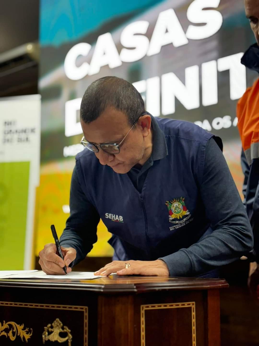 O governador Eduardo Leite assinou na manhã desta quinta-feira, dia 23, em Estrela a ordem de início para a construção das casas definitivas para desabrigados pelas enchentes de 2023 e 2024 no Rio Grande do Sul.