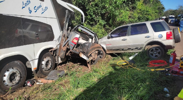 O condutor da Fiat Strada não resistiu aos ferimentos após batida frontal contra ônibus.