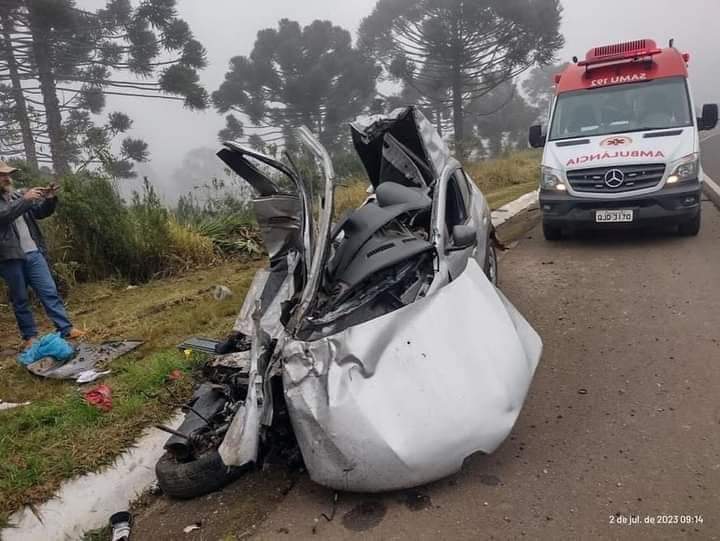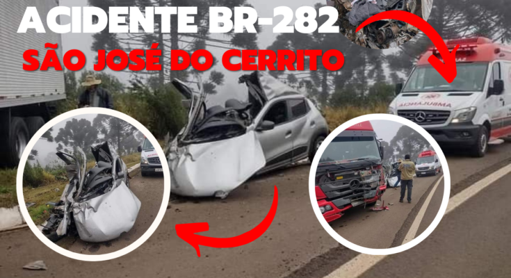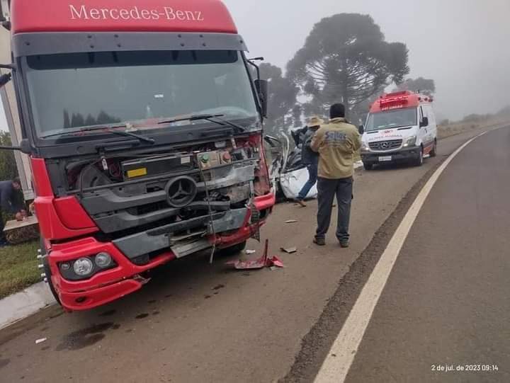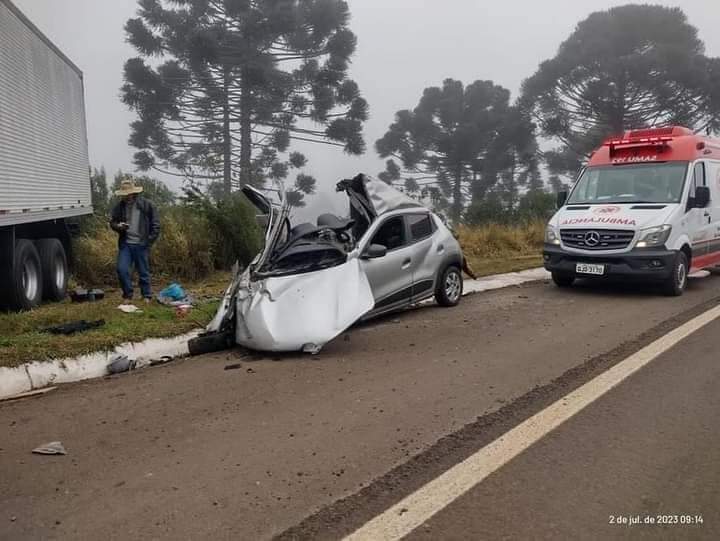 Na manhã de hoje (02), ocorreu uma grave colisão frontal entre um veículo Kwid e um caminhão próximo à cidade de São José do Cerrito, na BR-282. O impacto foi tão intenso que o condutor do veículo ficou preso nas ferragens, precisando de ajuda imediata.