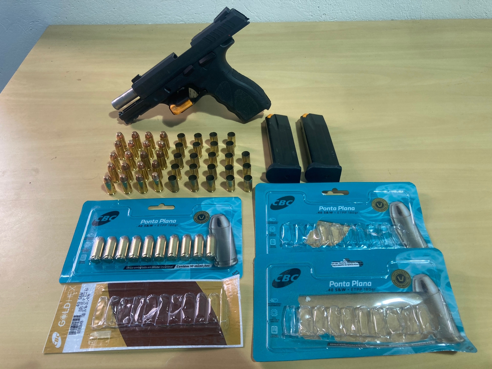 A arma utilizada pelo autor é uma pistola de calibre .40, com a pistola haviam 03 carregadores. No interior da residência, foi encontrado 01 blister com 10 munições do mesmo calibre, 03 blister vazios de 10 munições do mesmo calibre. Ao lado de fora, na frente da casa e na via pública, foi localizado o total de 23 estojos deflagrados e 01 munição intacta do mesmo calibre.