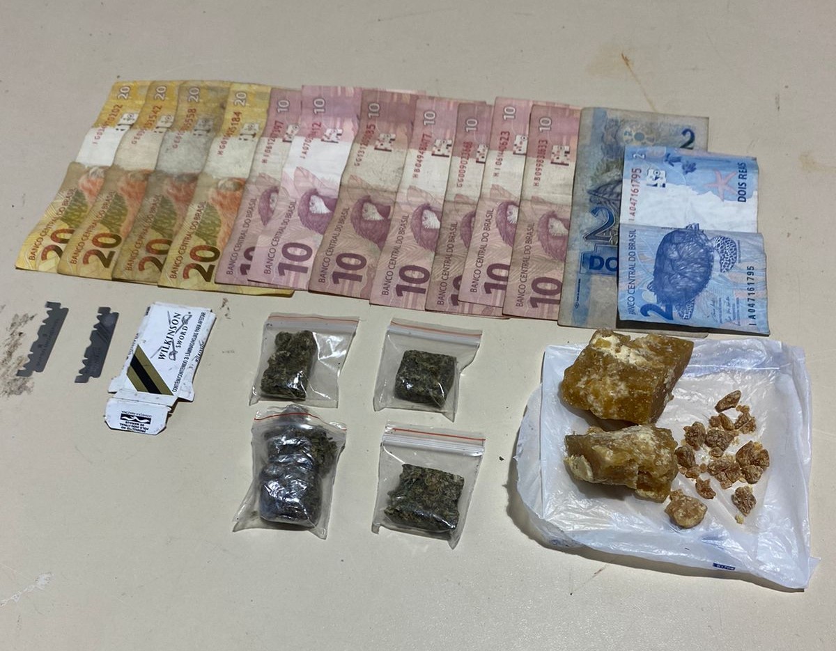 Em revista pessoal, foram encontrados uma bucha de substância análoga à crack, contendo 13 pedras, pesando aproximadamente 5,6 gramas, além de R$ 154,00 trocados em notas diversas.