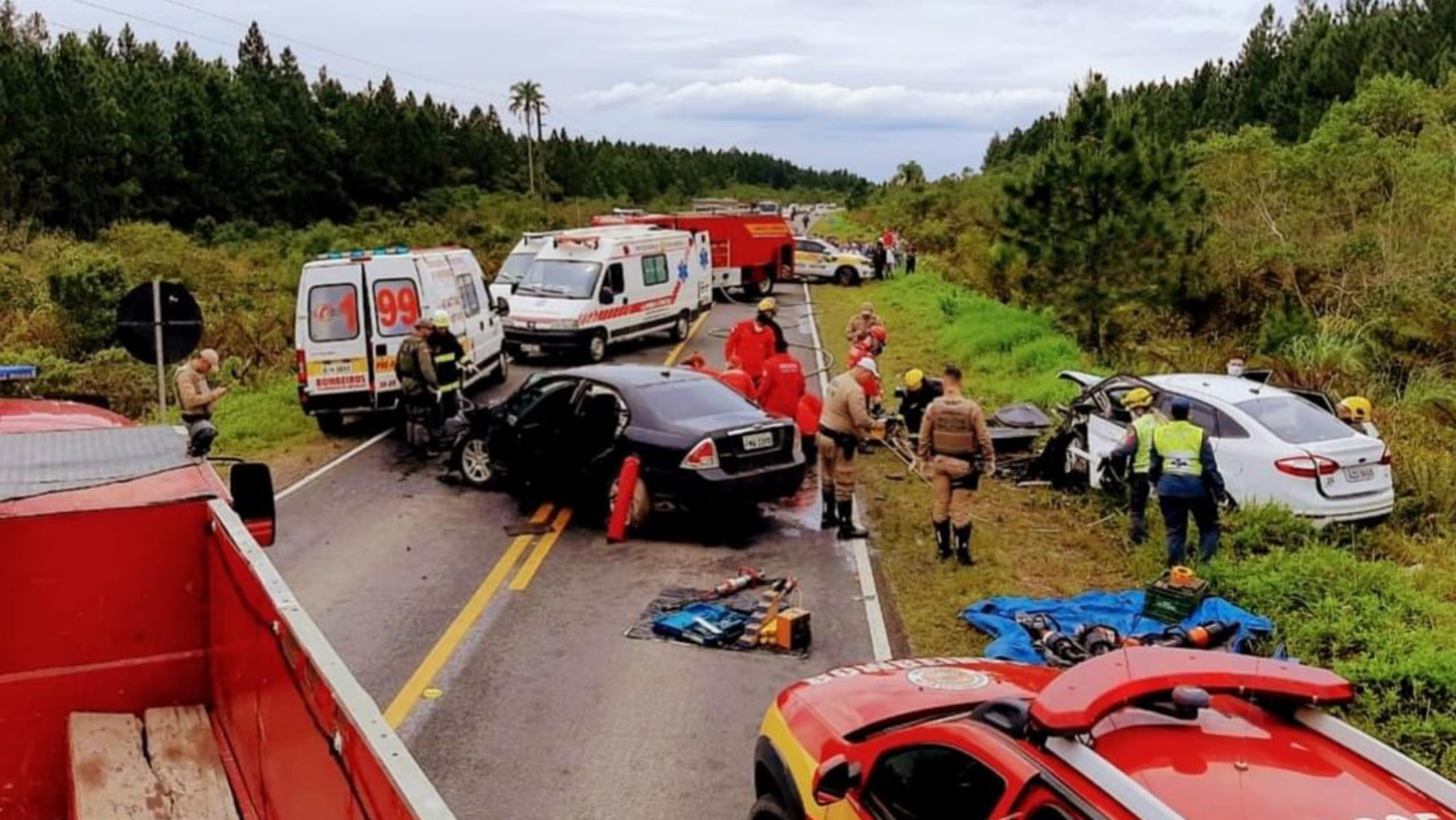 A colisão envolveu um Ford Fusion e um Ford Fiesta, por volta das 10h15. O motorista do Fiesta foi encontrado sem vida. A passageira tinha lesões graves e foi conduzida pelo helicóptero da Polícia Militar até o hospital São José, em Joinville.