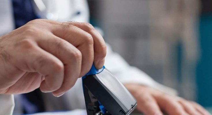 Imagem de um homem carimbando uma receita médica.