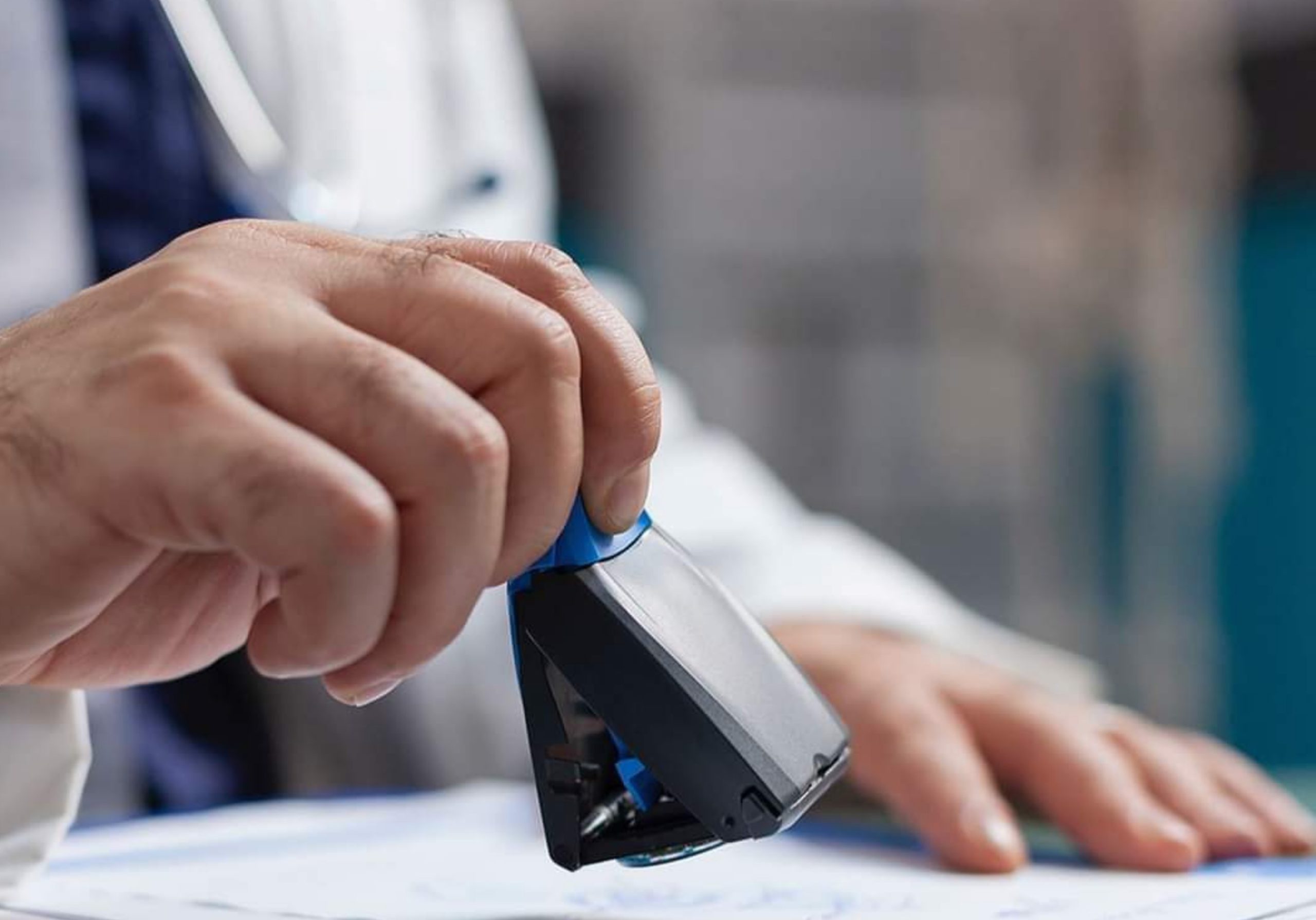 Imagem de um homem carimbando uma receita médica.