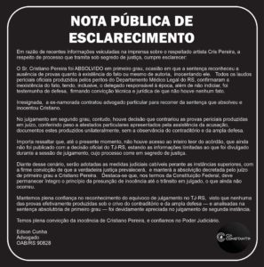 Em nota pública, a defesa de Cris Pereira afirmou que ele foi absolvido em primeiro grau e que a decisão de condenação não foi baseada em provas concretas, mas em atestados particulares. O advogado Edson Cunha reafirmou a confiança na inocência de Pereira e que medidas judiciais serão adotadas para reverter a condenação.