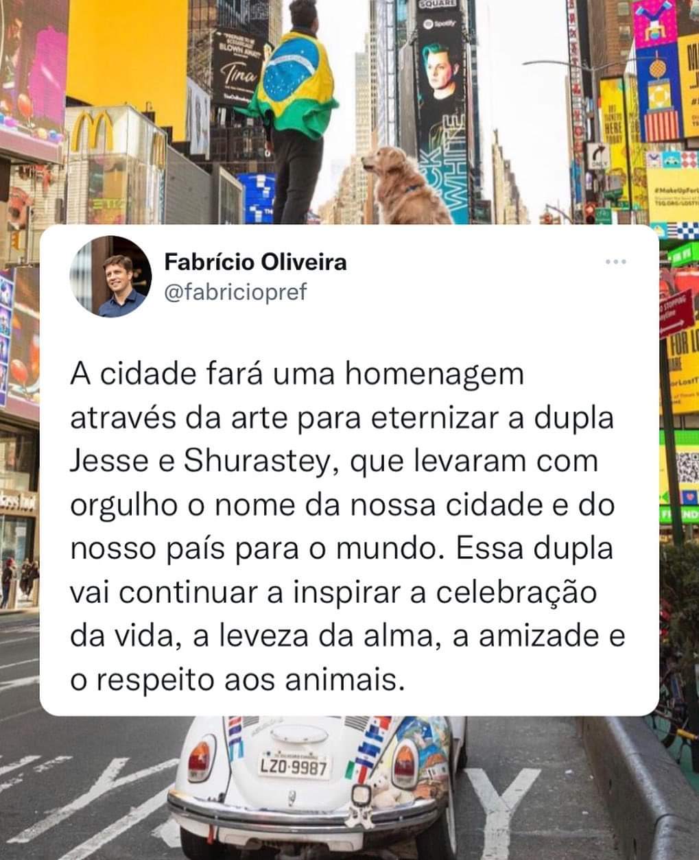 “A cidade fará uma homenagem através da arte para eternizar a dupla Jesse e Shurastey, que levaram com orgulho o nome de nossa cidade e do nosso país para o mundo. Essa dupla vai continuar inspirando a celebração da vida, a leveza da alma, a amizade e o respeito aos animais”, pontua o prefeito Fabrício Oliveira.