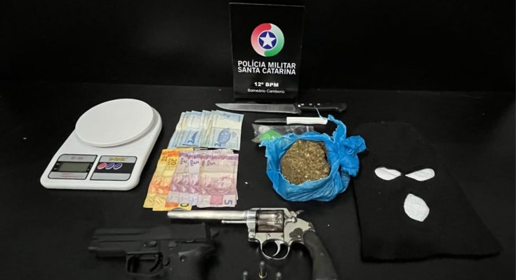 Na residencial, foi localizado um revólver calibre .38 de numeração suprimida, quatro munições do mesmo calibre, um simulacro de pistola 9mm e uma balaclava, além de uma balança de precisão, duas facas com resquícios de droga e 400 gramas de maconha .