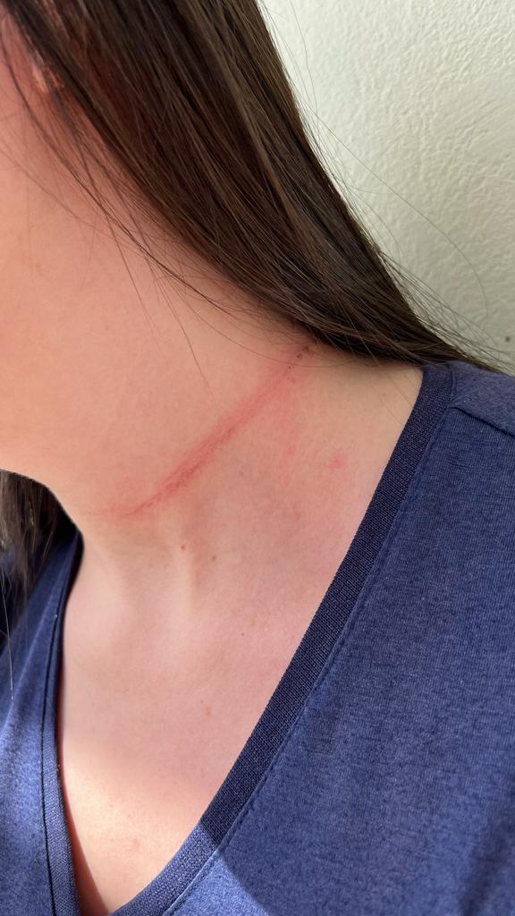 “Até achei que era minha corrente que eu uso no pescoço, parei a moto e olhei no espelho e vi que estava cortado. Tinha uma linha, mas eu não conseguir vê-la, só sei que onde aconteceu o ocorrido tinha uma pipa pendurada no fio. Não tinha ninguém soltando pipa no momento, e segui o caminho para casa sozinha.” Contou a mulher.