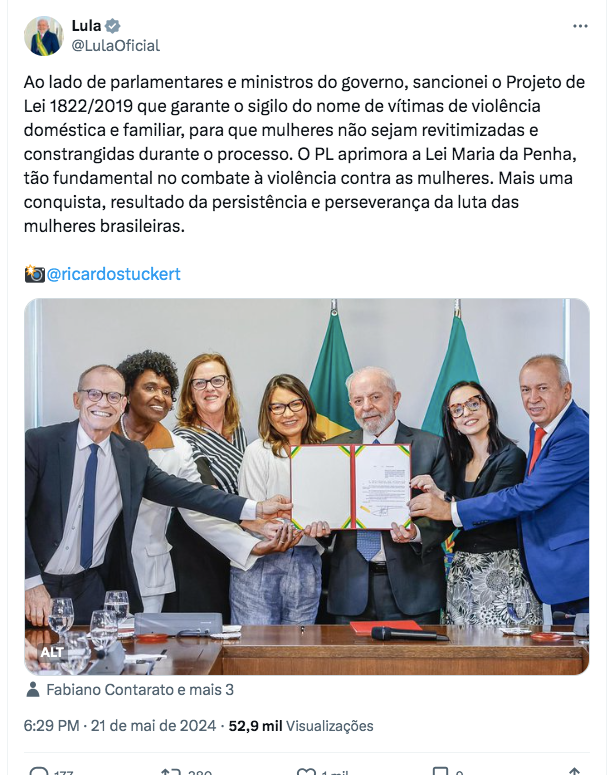Petista disse que medida “aprimora a Lei Maria da Penha”. A medida altera a Lei Maria da Penha e tem o objetivo de uniformizar a proteção da privacidade das vítimas.