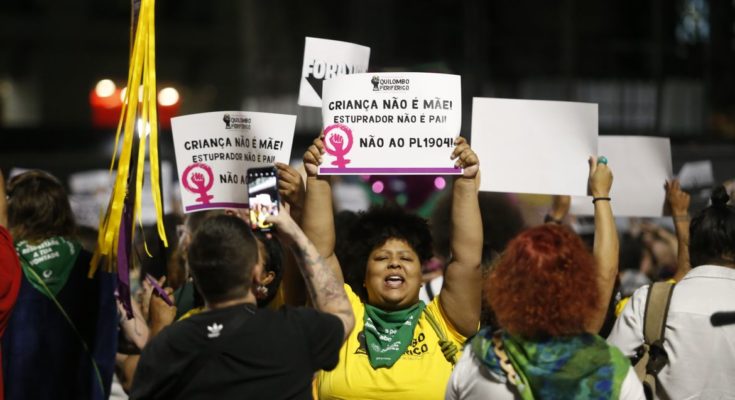 Em São Paulo, o protesto foi realizado na Avenida Paulista, em frente ao Museu de Arte de São Paulo (Masp), sob gritos de “Criança não é mãe”, “Respeitem as mulheres” e “Fora Lira” [Arthur Lira, presidente da Câmara dos Deputados].