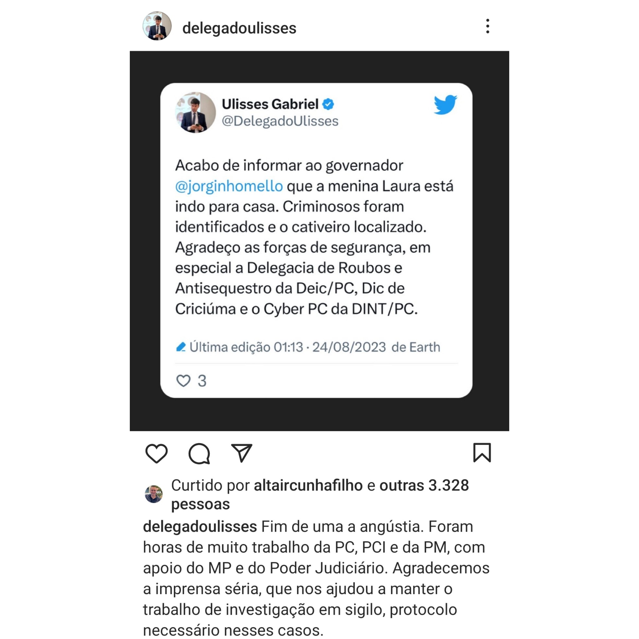 menina de 11 anos, identificada como Laura Guedin Tessmann, sequestrada na madrugada de terça para quarta-feira, dia 23, em frente à sua casa em Criciúma, foi encontrada pela polícia.