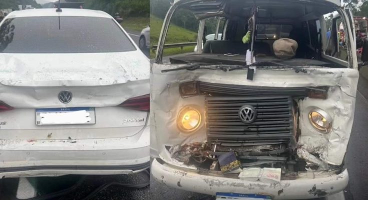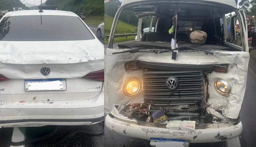 Segundo informações dos bombeiros, o motorista da Kombi ficou preso às ferragens após a colisão traseira com o veículo de passeio, na BR 101, km 128, nessa manhã de quinta-feira (25).
