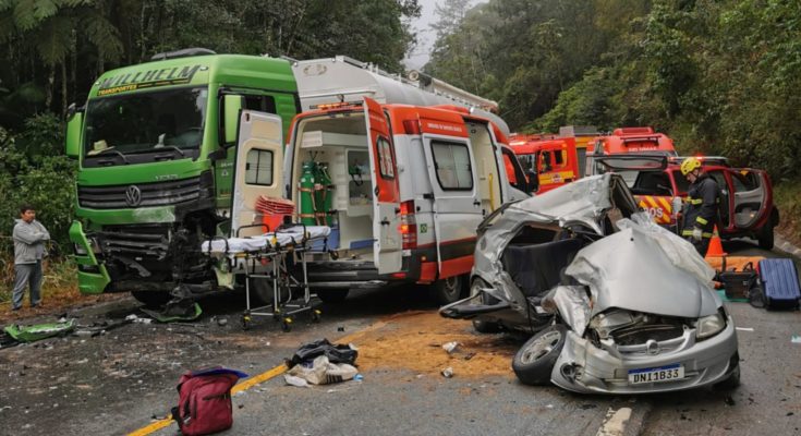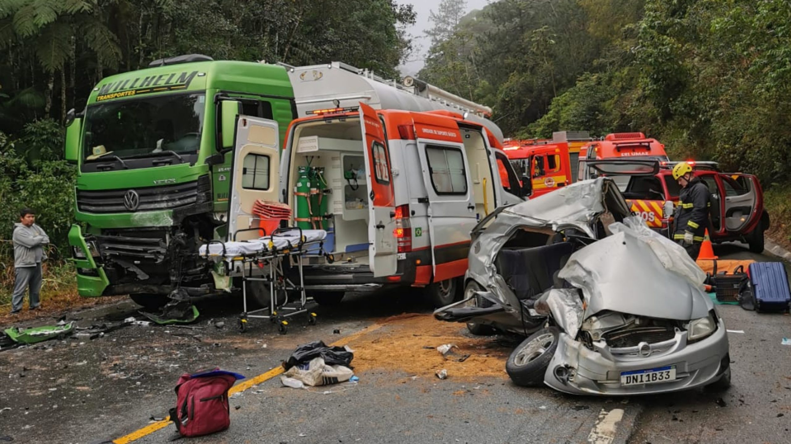 Histórico: As guarnições de Santo Amaro da Imperatriz e Rancho Queimado foram acionadas no início da manhã de hoje para uma colisão frontal carro x caminhão.