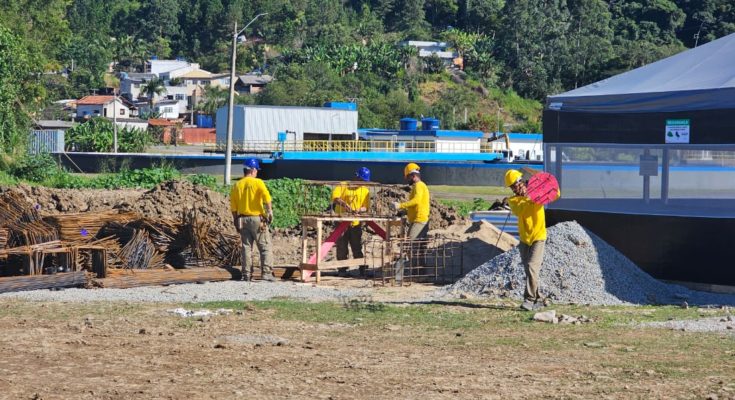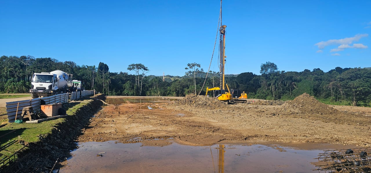 A ampliação e modernização do sistema de tratamento preliminar da Estação de Tratamento de Esgoto (ETE) da Empresa Municipal de Água e Saneamento (Emasa), em Balneário Camboriú, avança com a execução da fase de estaqueamento da obra. Após a conclusão da terraplanagem, as perfurações e concretagens já estão em andamento, com moldes de armação de aço sendo preparados para as próximas etapas estruturais.