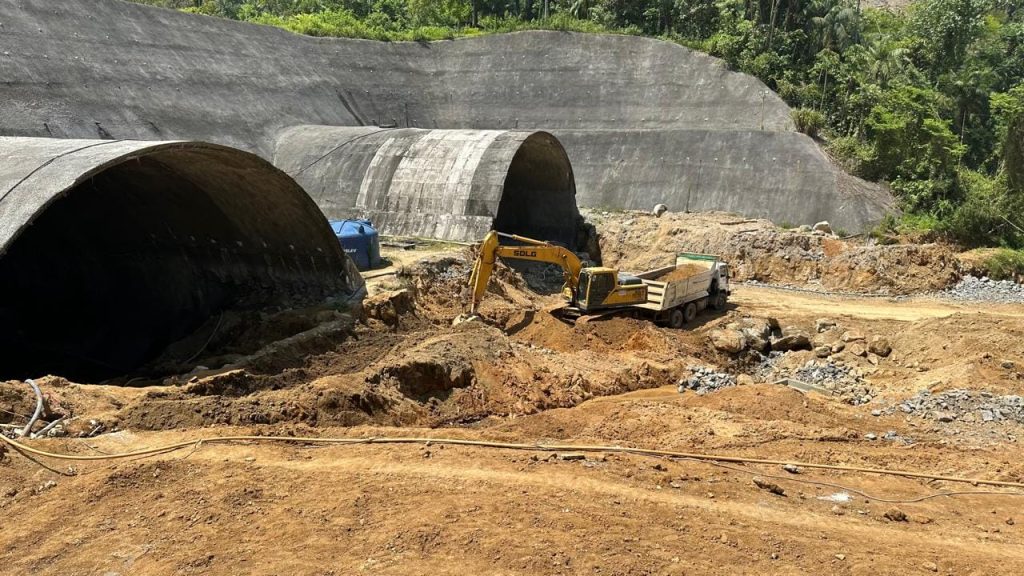 O outro lote em Guaramirim encerra até o fim do ano, enquanto o segmento São Francisco do Sul-Araquari (36 km) retoma em breve após licitação. Iniciada em 2014, a duplicação total de 75 km da BR-280 ganha fôlego agora, marcando um renascimento na logística de SC.Foto: DNIT/Divulgação – Elevados de acesso ao túnel duplo em construção.