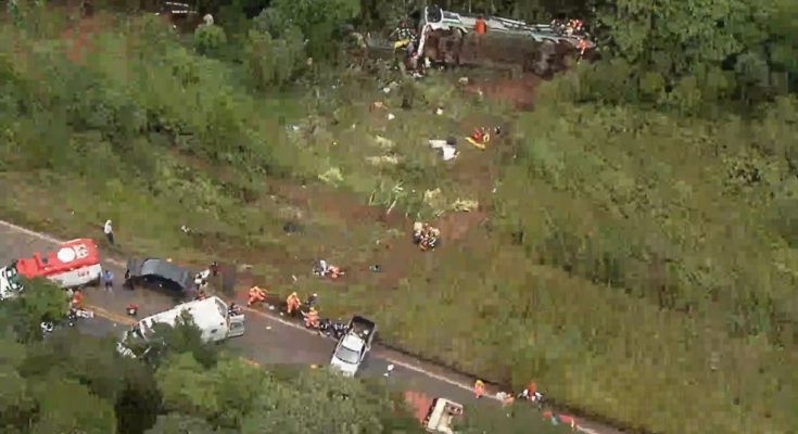 De acordo com o Corpo de Bombeiros, coletivo transportava 28 passageiros e pelo menos cinco estão em estado grave.