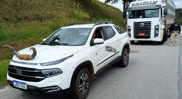 Durante operação para checar freios em veículos de carga, os agentes flagraram uma picape com um perigoso “chifre de boi” – uma haste pontiaguda de metal – instalada bem na ponta do capô dianteiro.