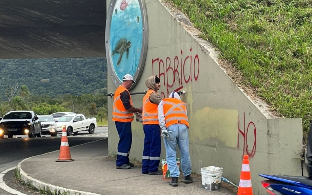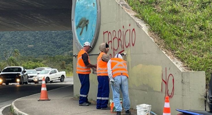 A pichação é considerada crime pela lei brasileira e a Secretaria de Obras do município realizou a limpeza dos locais afetados.