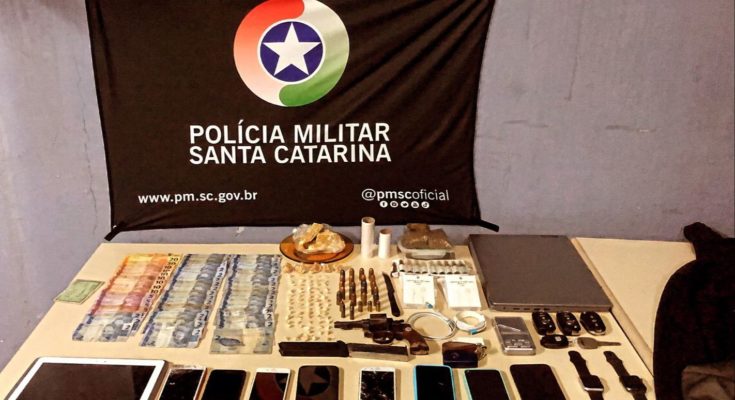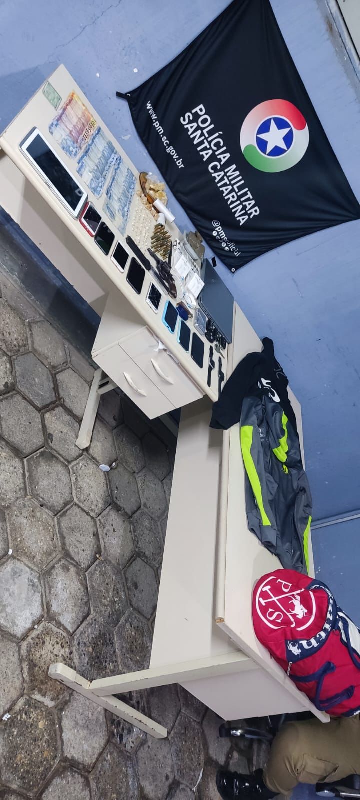 Na residência indicada, foi abordado o quinto autor, de 16 anos, sendo localizado um revólver calibre .32, com numeração suprimida, 26g de crack, 183g de maconha, além de um moletom preto utilizado no momento do roubo, conforme imagens do sistema de monitoramento.