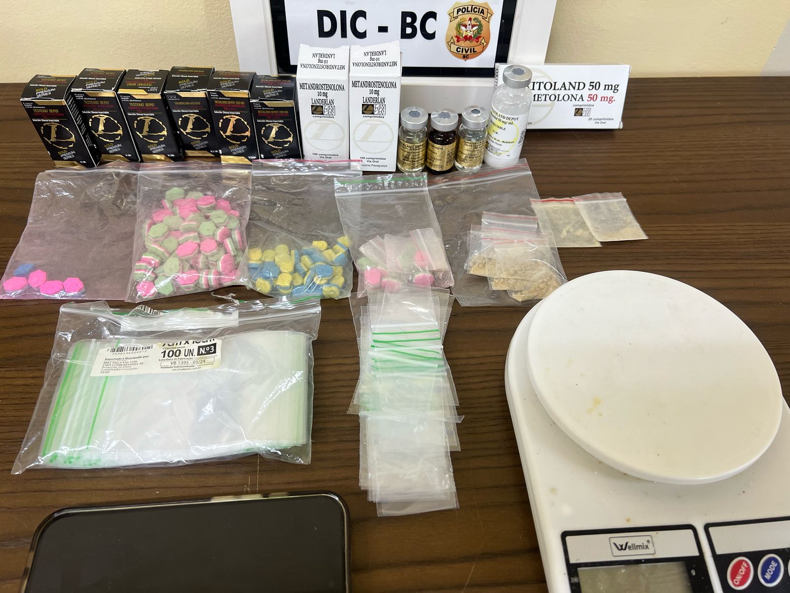 Por ocasião do cumprimento do mandado na residência do suspeito foram apreendidos cerca de 116 comprimidos de ecstasy, 11 gramas de MDMA dividas em diversas porções, 12 frascos e caixas de anabolizantes, balança de precisão e material para embalar as drogas.