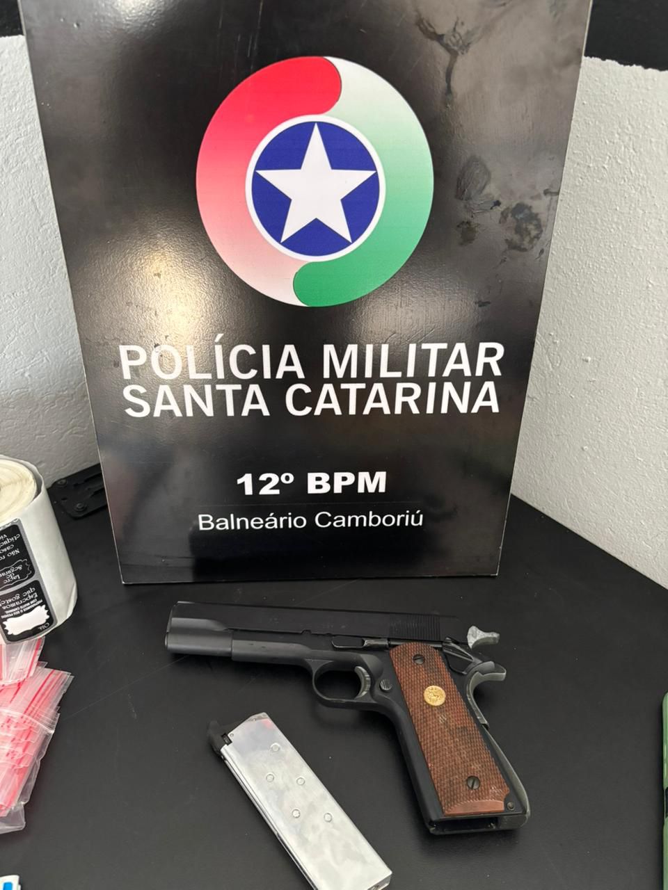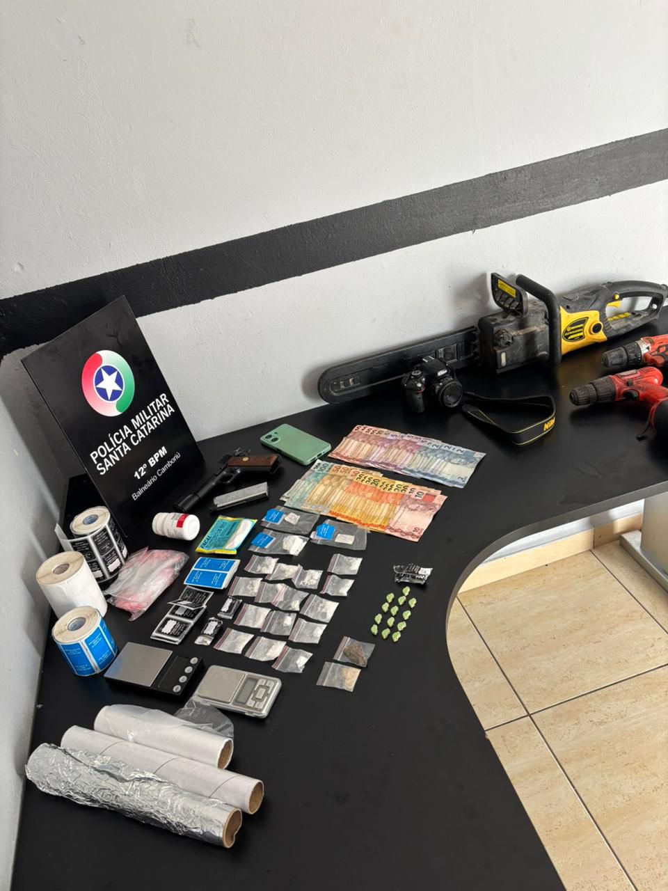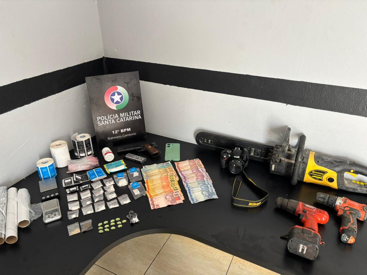 Já no imóvel do suspeito, na Rua Ipê, em Camboriú, foram encontrados diversos objetos de origem duvidosa, drogas (maconha, ecstasy, MDMA e cocaína), alem de um simulacro de pistola.