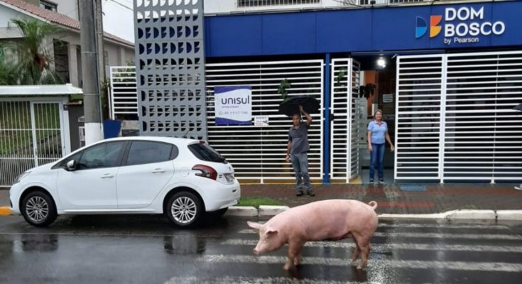 “O pessoal do Colégio Dom Bosco recebeu uma visita hoje de manhã. O suíno estava solto na rua correndo risco de atropelamento, mas conseguimos colocar ele na garagem”, disse a mulher.