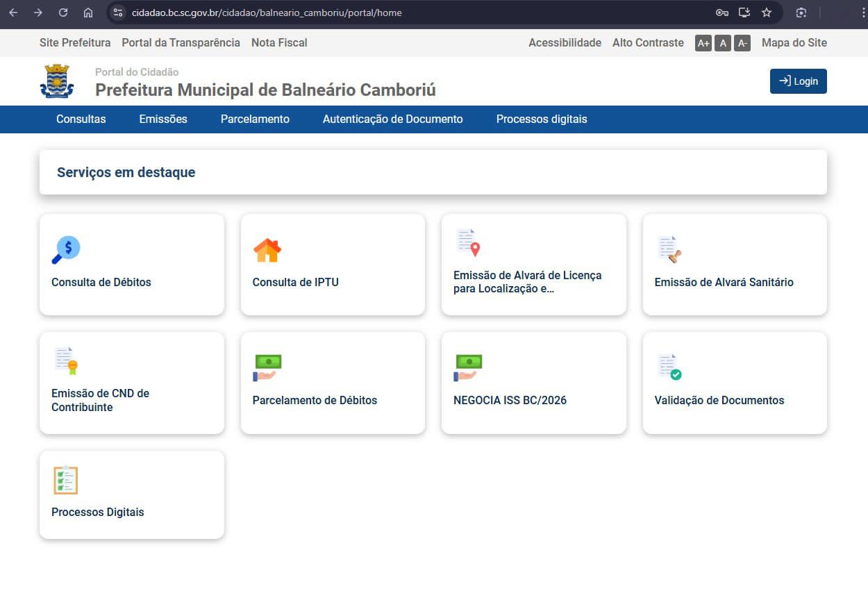 A Prefeitura de Balneário Camboriú, por meio da Secretaria da Fazenda, disponibiliza aos contribuintes canais para consulta de débitos de Imposto Sobre Serviços (ISS), Imposto Predial e Territorial Urbano (IPTU) e alvarás.