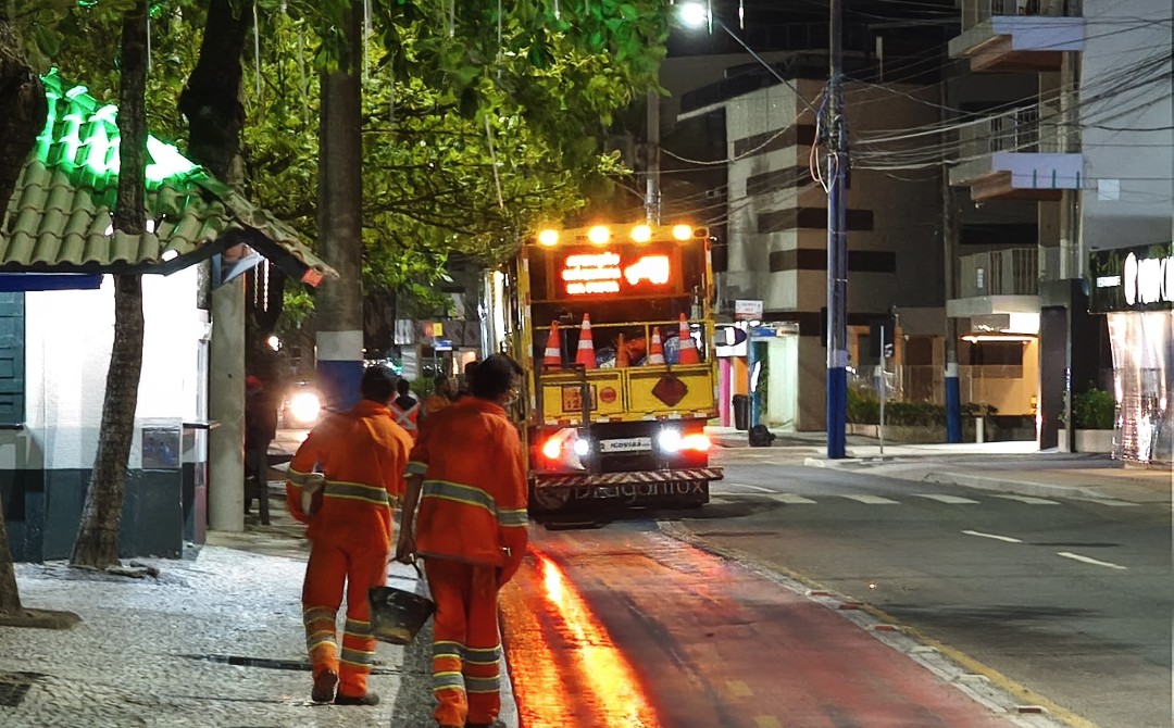 A Prefeitura de Balneário Camboriú, por meio da Autarquia Municipal de Trânsito (BC Trânsito), iniciou na noite desta terça-feira (11) a pintura da ciclofaixa na Avenida Atlântica, na altura da Rua 2800. A ação faz parte de um amplo pacote de requalificação da sinalização viária que contempla toda a extensão da avenida e diversas outras vias da cidade.