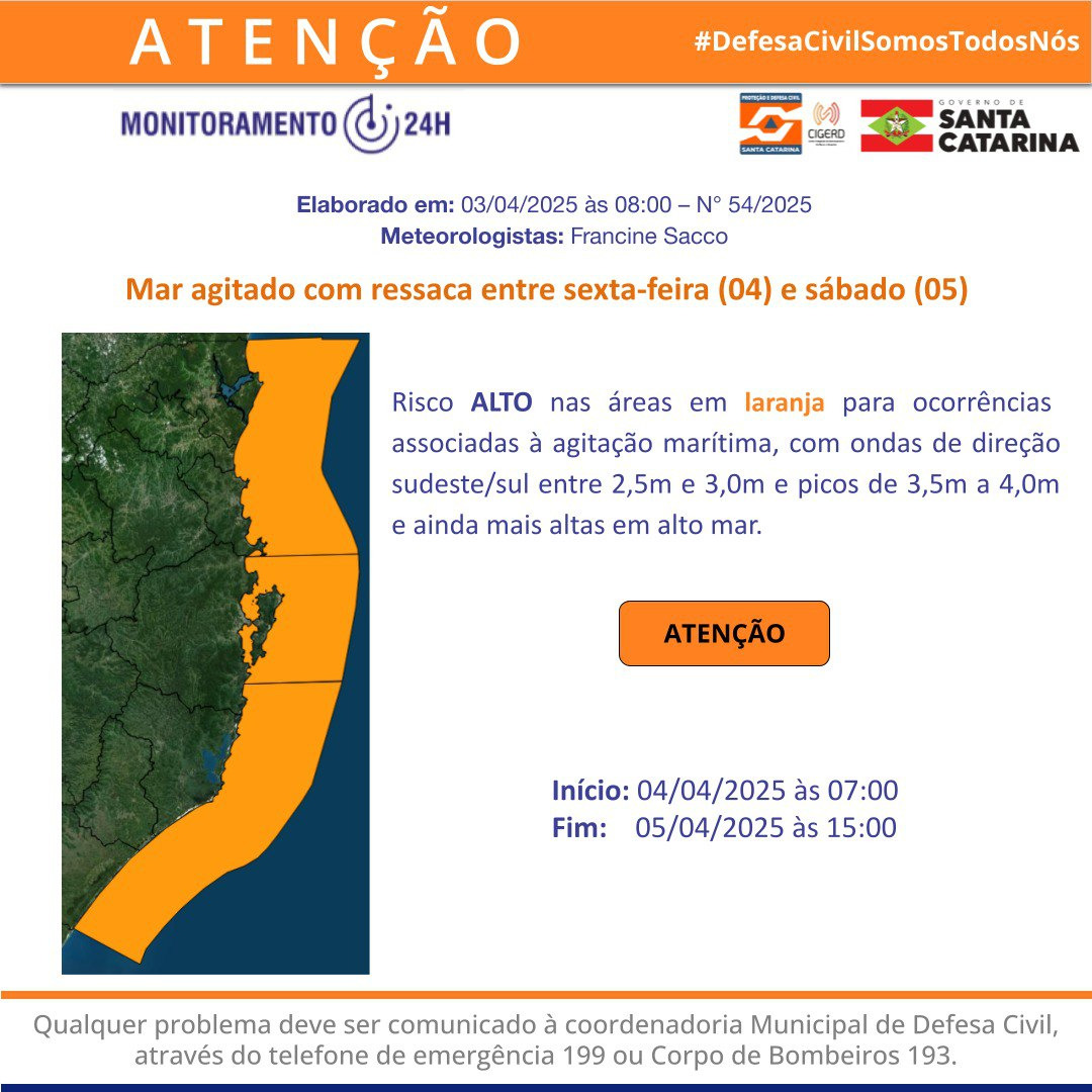 Ao mesmo tempo, a partir das 7h de sexta-feira (4) até às 15h de sábado (5) é possível que o mar esteja agitado com ressaca. O risco é alto para ocorrências associadas à agitação marítima, podendo registrar ondas de direção sudeste/sul entre 2,5m e 3m e picos de 3,5m a 4m, podendo ser ainda mais altas em alto mar.