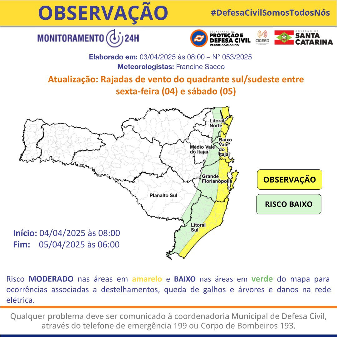 A previsão da Defesa Civil indica a possibilidade de rajadas de vento no quadrante sul/sudeste entre às 8h de sexta-feira (4) e 6h de sábado (5). Com isso, o risco é moderado para ocorrências associadas a destelhamentos, queda de galhos e árvores e danos na rede elétrica. Balneário Camboriú está em observação.