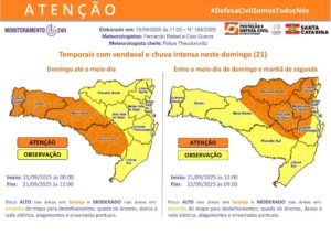 Previsão do tempo divulgada pela Defesa Civil estadual indica possibilidade de temporais para a região de Balneário Camboriú a partir das 12h deste domingo (21). Há risco de tempestades e ventos fortes – condição que oferece risco associado para quedas de árvores, rede elétrica danificada e destelhamentos, além de enxurradas e alagamentos.