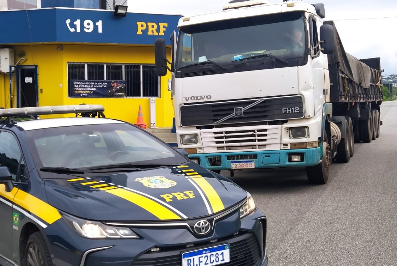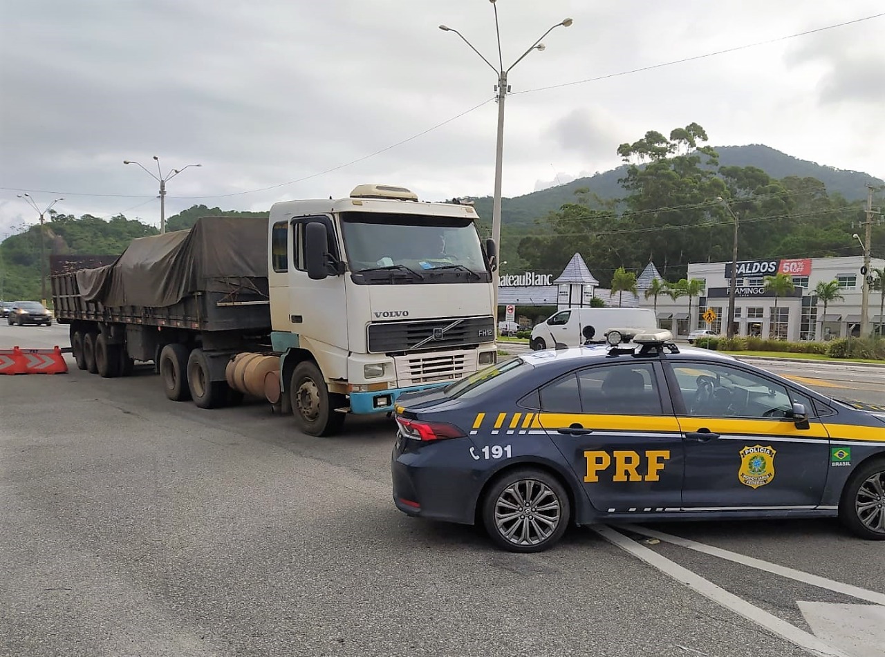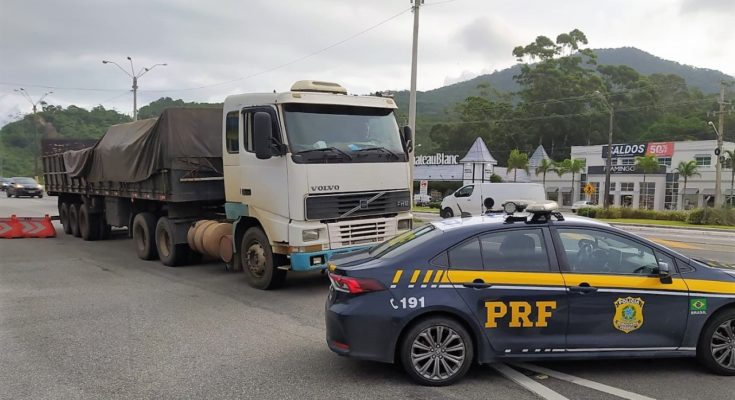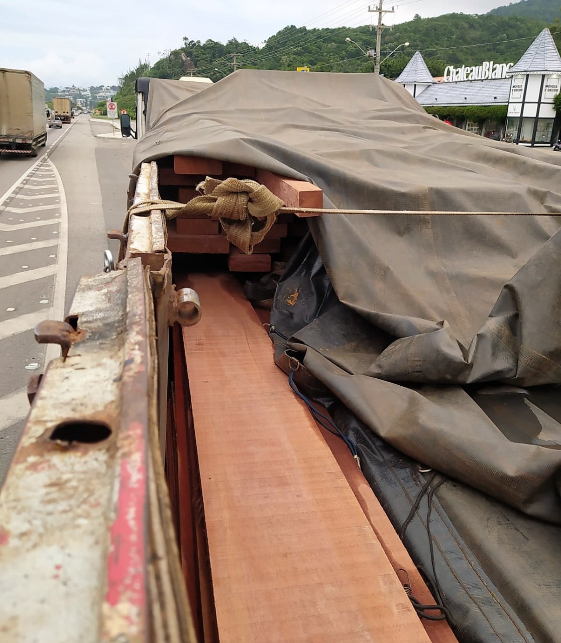 Crime ambiental: Durante fiscalização nesta quarta-feira (18), na BR-101 em Itapema, policiais rodoviários federais interceptaram carga de madeira nativa da região amazônica sem os devidos comprovantes de origem florestal e fiscal.