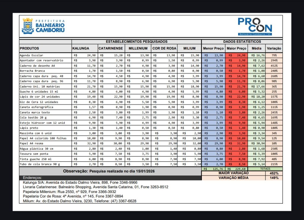O Procon de Balneário Camboriú divulgou nesta sexta-feira (16) o resultado da pesquisa de preços de material escolar realizada no dia 15 de janeiro em cinco papelarias da cidade. O levantamento revelou que o consumidor pode encontrar diferenças expressivas nos valores cobrados, a depender do estabelecimento.