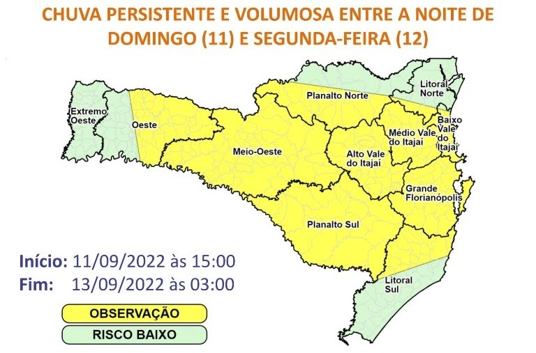 Além de risco de temporais isolados, a partir do Oeste catarinense para este domingo, o órgão destaca que há possibilidade de alagamentos e deslizamentos provocados pela chuva volumosa.