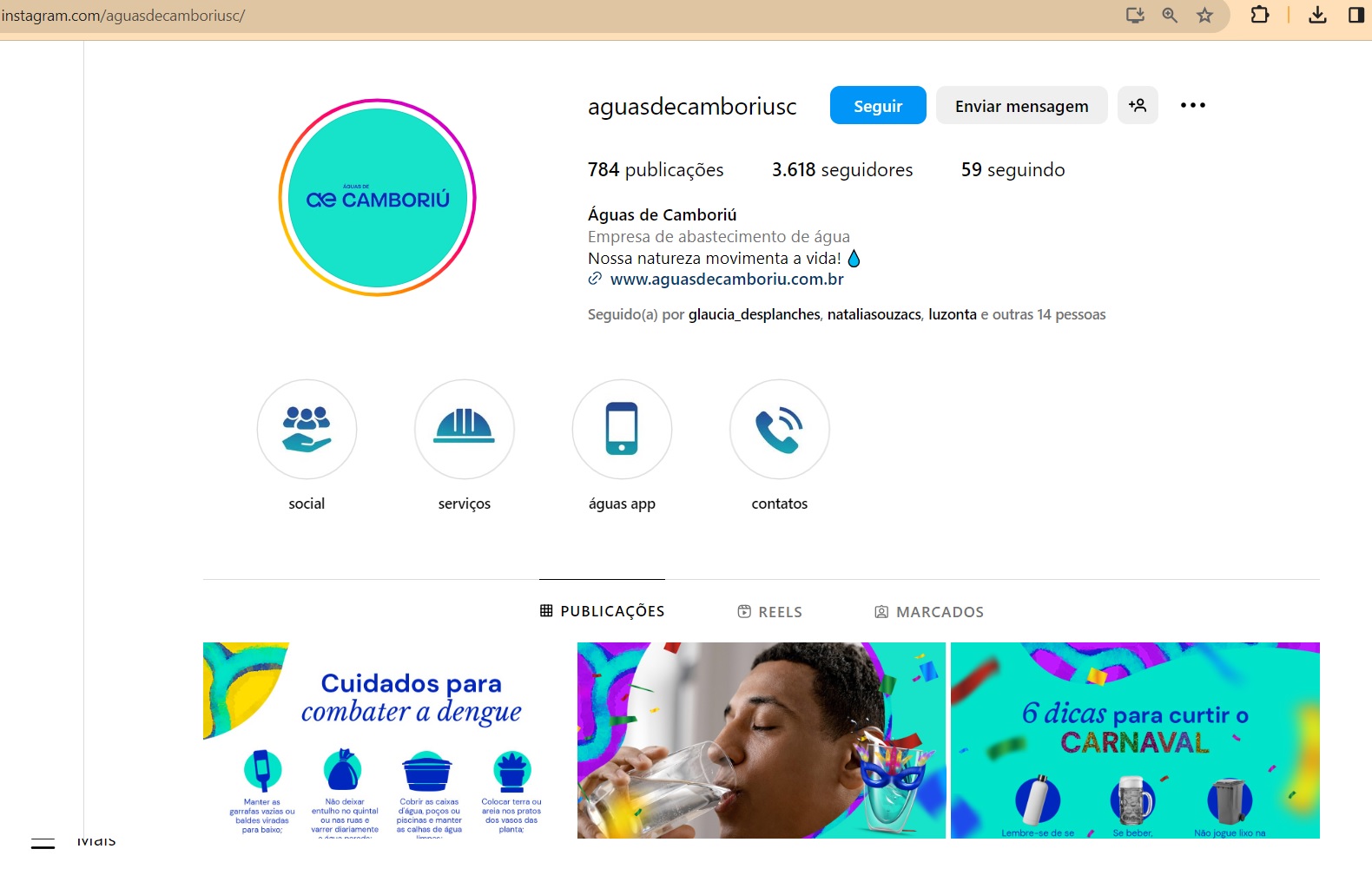 Você já segue a Águas de Camboriú no Facebook e Instagram? Não perca tempo, nas redes sociais você fica por dentro de todas as novidades da empresa. A concessionária dispõe de um setor específico para as comunicações da empresa, na produção e divulgação das notícias, publicações de materiais nas redes sociais e envio de SMS para os moradores.