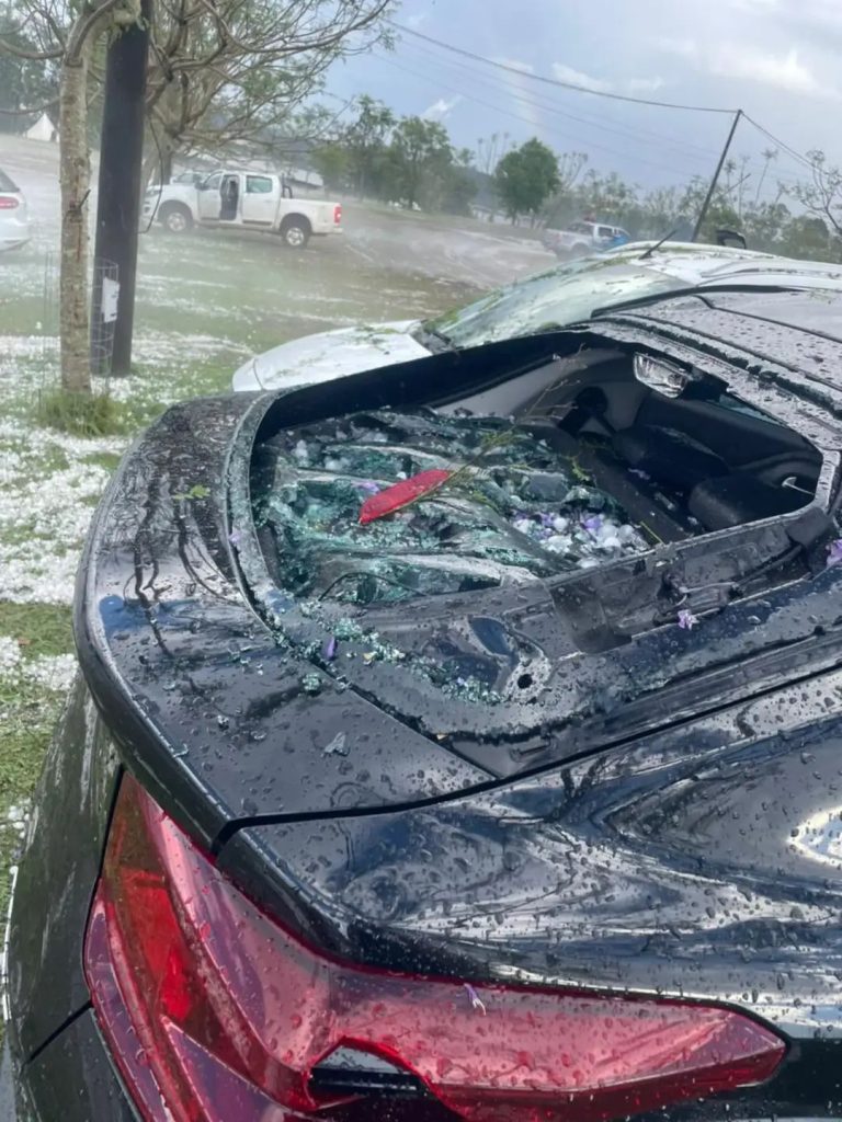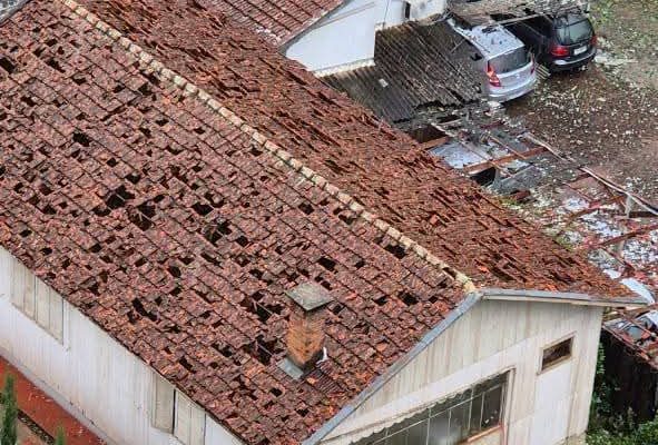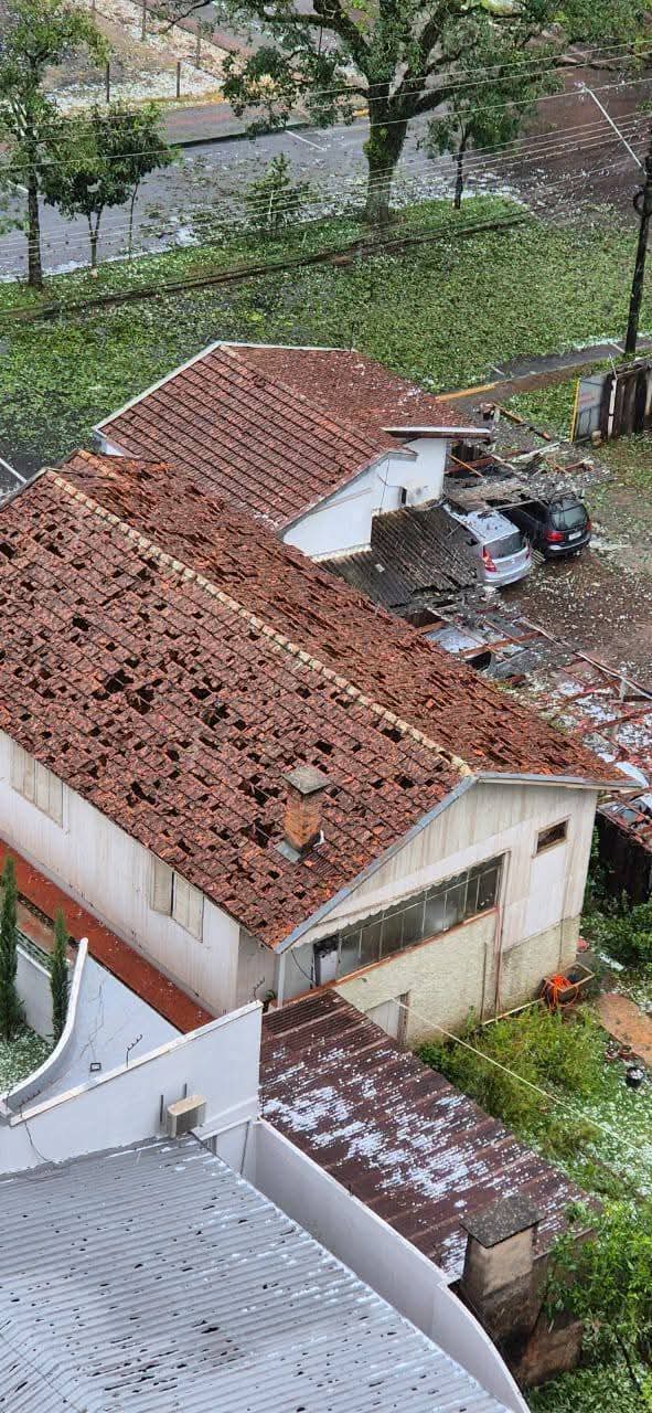 Os danos preliminares apontam para telhados perfurados, vidraças quebradas e veículos bastante atingidos, com latarias amassadas e vidros destruídos.