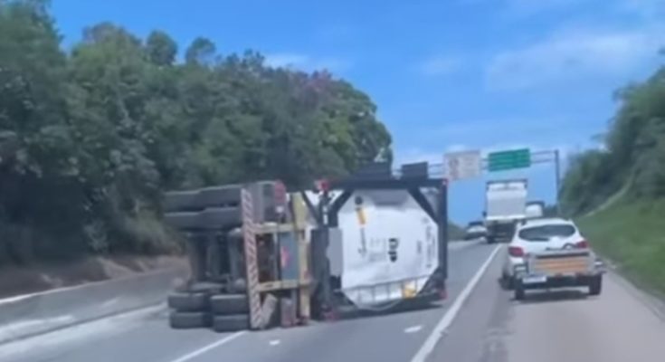 Tombamento de carreta com carga perigosa interdita BR-101 em Araquari