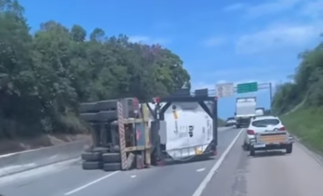Tombamento de carreta com carga perigosa interdita BR-101 em Araquari