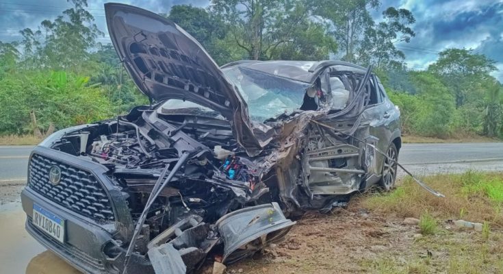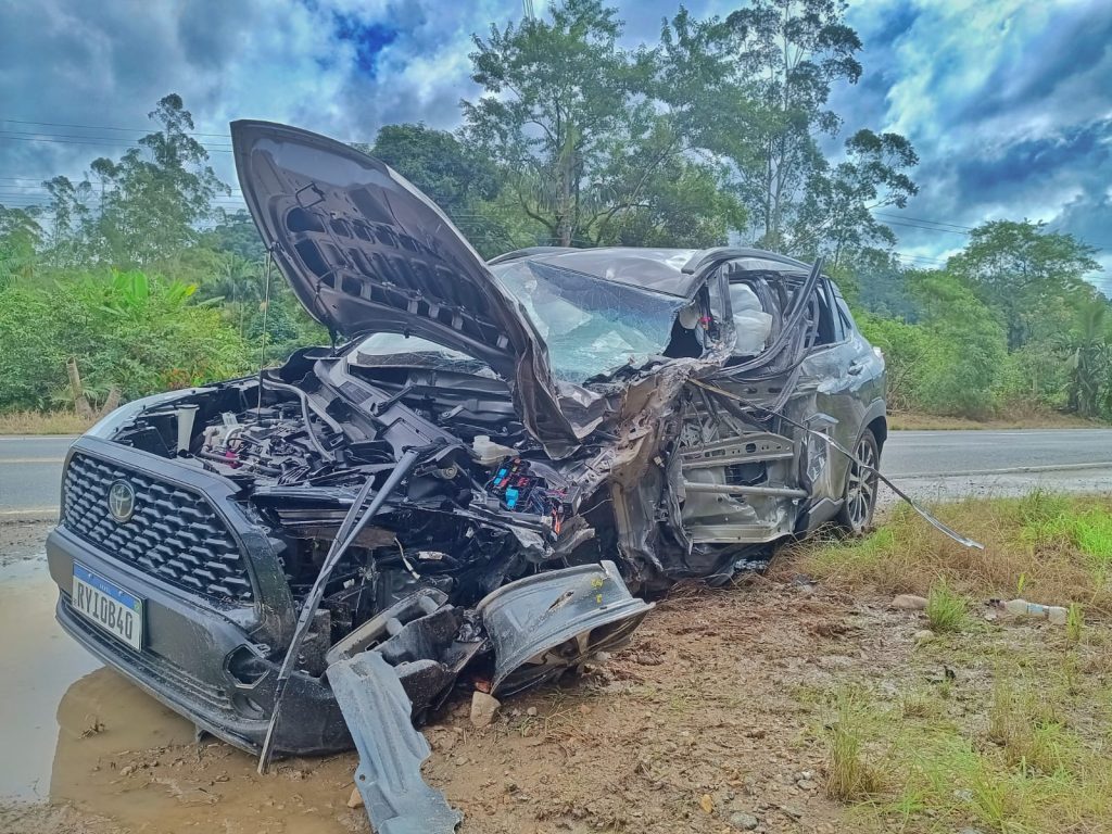 Os Bombeiros Voluntários foram acionados por volta das 10h50 para atender a ocorrência. Segundo relato do condutor do caminhão ao Portal de Notícias OCP, o Toyota Corolla Cross invadiu a contramão e colidiu com a roda dianteira do veículo de carga. O impacto foi tão forte que o caminhão saiu da pista.
