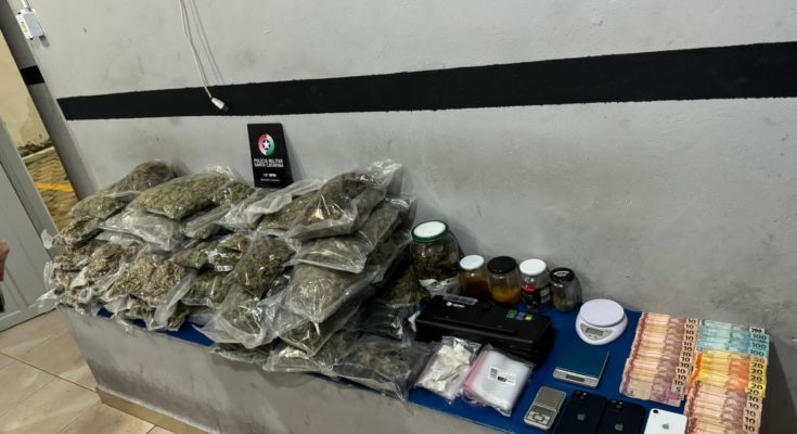 A terceira suspeita foi abordada ainda na Barra Sul. Em sua residência, na Avenida Oswaldo Reis, foi localizado a quantia aproximada de 23kg de skunk, 1,2kg de haxixe, 2 vidros de conserva, contendo óleo de maconha.
