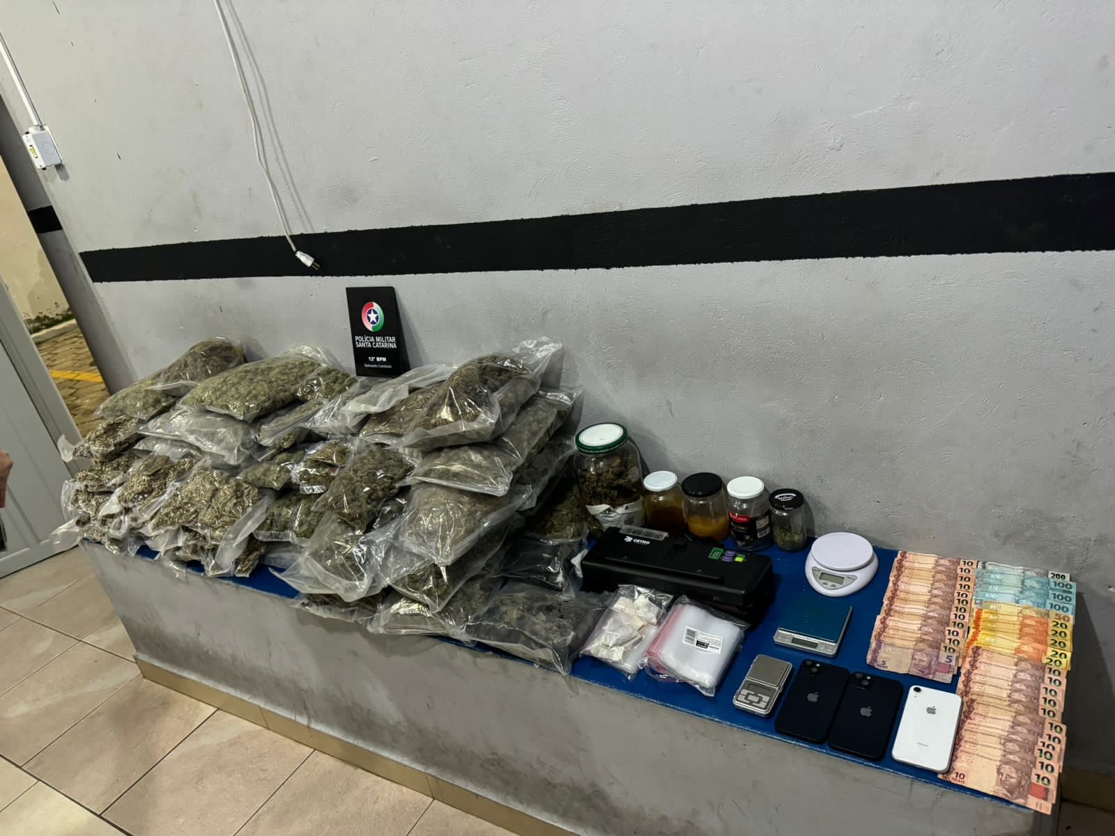 A polícia então realizou a abordagem das três mulheres e, durante a revista, foram encontrados diversos itens relacionados ao tráfico de drogas. Foram apreendidos 23kg de skunk, uma droga conhecida por ser uma variação mais potente da maconha, 1,2kg de haxixe, uma balança de precisão, dois potes com óleo de maconha, além de R$865,00 em dinheiro.