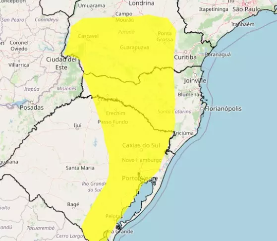 Em Santa Catarina, o mapa inclui quase todo o estado, com exceção do Leste. No Rio Grande do Sul, no entanto, a faixa Leste do estado deve ser afetada pela onda de calor.