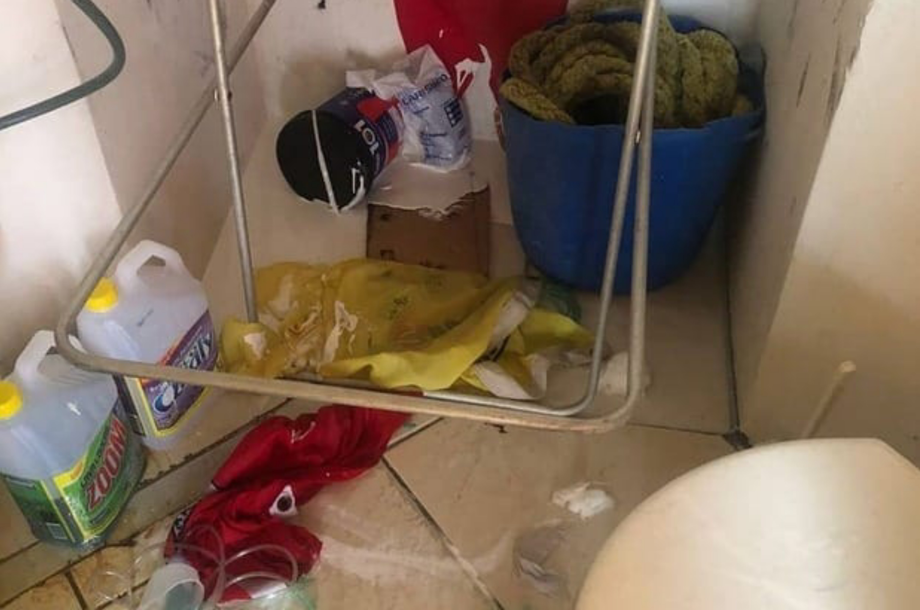 Um bule foi jogado no chão, fitas e correntes de isolamento foram largadas no local, um espelho foi quebrado, uma torneira foi arrancada de uma pia, o cano de conexão desta torneira foi retirado do local, sanduicheiras, fôrmas e um micro-ondas foram também atingidos, e até mesmo uma máscara de oxigênio foi estragada.