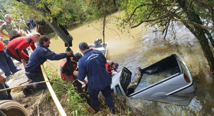 Com auxílio de tratores foi possível a ancoragem do veículo, mais o corpo do homem não estava no Interior da Saveiro.