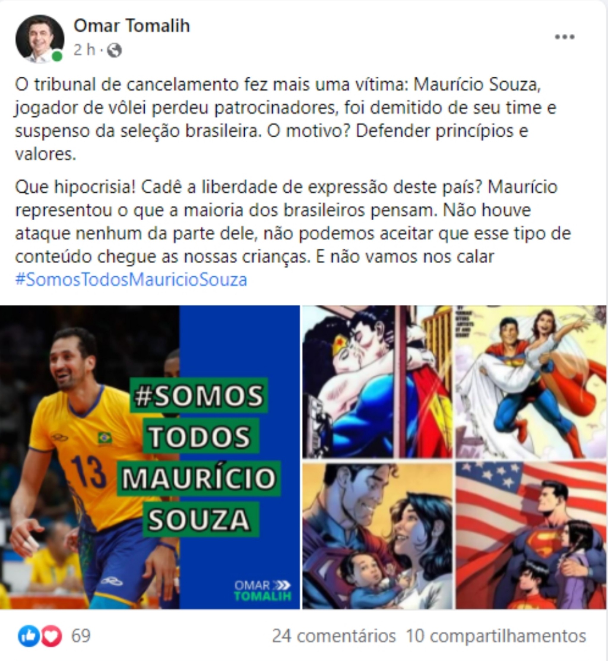 O vereador Omar Tomalih publicou em seu Facebook, na tarde desta sexta-feira, 29, postagem em defesa do jogador de vôlei Maurício de Souza, que teve seu contrato de atleta rescindido com o Minas Tênis Clube e foi banido da Seleção Brasileira em decorrência de manifestações homofóbicas.